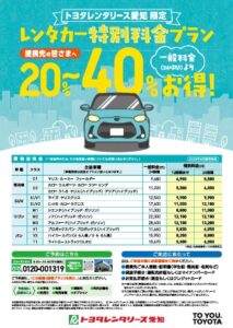 在学生・教職員の方限定で、トヨタレンタリース愛知のレンタカーをお得なプライスにてご利用いただけます!